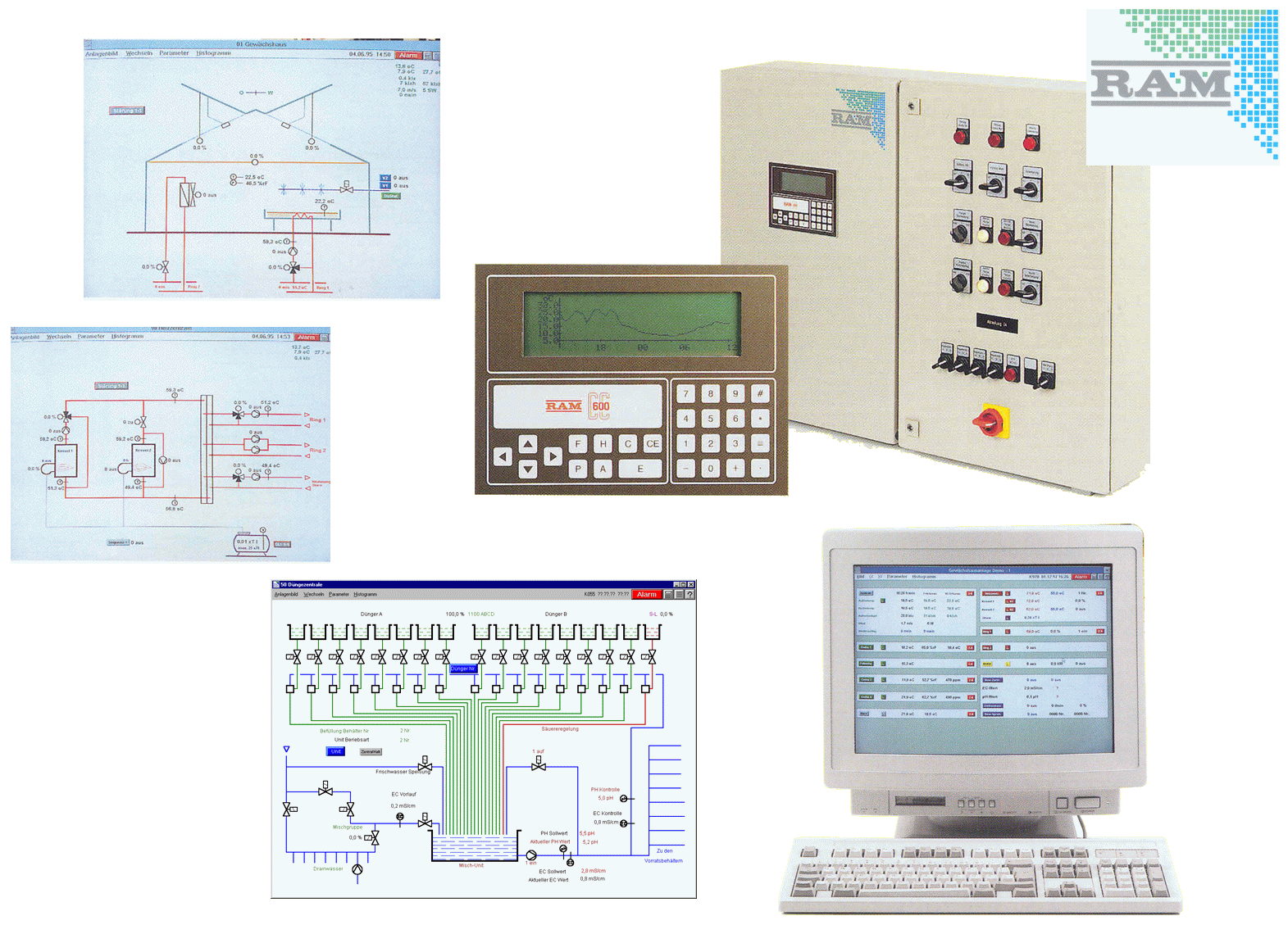 Analog oder doch Klimacomputer war für RAM lange eine Frage. Die gartenbauspezifischen Regelanforderungen wurden und werden durch ein umfangreiches Analogregelgeräteangebot sehr gut erfüllt. Relativ spät wurde auch von RAM ein Klimacomputer angeboten, dafür sehr ausgereift und praxisnah durch die gute Analoggeräteerfahrung programmiert. Die erste Anlage auf Computerbasis = CC600 wurde dann 1985 von RAM im Rheinland installiert - mit 14 Regelabteilungen gerade keine kleine Anlage. Zur Entscheidungsfindung hatte der Gartenbaubetrieb damals „alle Register“ gezogen und sorgfältig vergleichen. RAM, van Vliet, Indal, Priva und Mrotzek wurden geprüft und verglichen. Sicherlich hatte neben den Geräteargumenten mindestens so stark auch die Bewertung des Elektro-Installationsbetriebes die Entscheidung geprägt. Bis heute, fast 30 Jahre später, arbeitet noch die Grundstruktur der damaligen Installation. Sicher hier und da aktualisiert, aber nicht wie bei einigen niederländischen Anbietern, schon nach wenigen Jahren komplett austauschbedürftig, weil ein völlig neues Computerkonzept eingeführt wird. Für die niederländische Struktur sicherlich oft sinnvoll, für den deutschen Gartenbau wird aber in viel längeren Zeiträumen gedacht, wie auch das Beispiel der ersten Anlage unterstreicht. Bei RAM ist eine umfangreiche Bedienoberfläche mit vielfältigen grafischen Kontrollmöglichkeiten, sowie Fernbedienung über Smartphones und Tablets heute selbstverständlich. Den Trend neben dem eigentlichen Regelprozessrechner noch eine umfangreiche Bediensoftware mit Datenspeicherung auf dem „Büro-PC“ zu haben, folgen heute praktisch alle Hersteller. Speicherplatz ist heute billig geworden. In den Anfängen musste man noch um jedes Kilobyte kämpfen, so stehen heute Terrabyte zur Verfügung. Deshalb sollte auch jeder Datenpunkt in der Historie alle 2 Minuten gespeichert werden, denn welche Datenpunkte für eine Auswertung benötigt werden, erkennt man erst später bei der Auswertung.